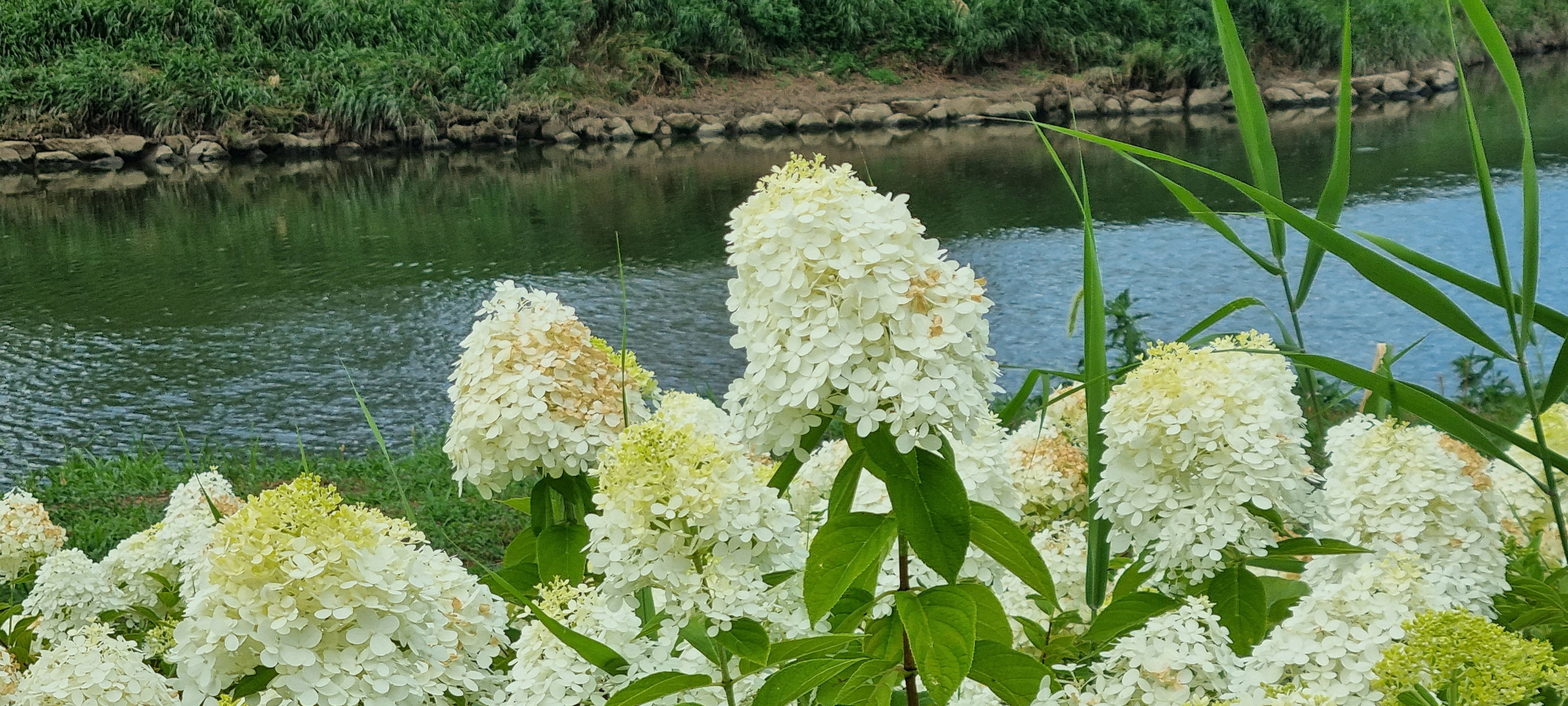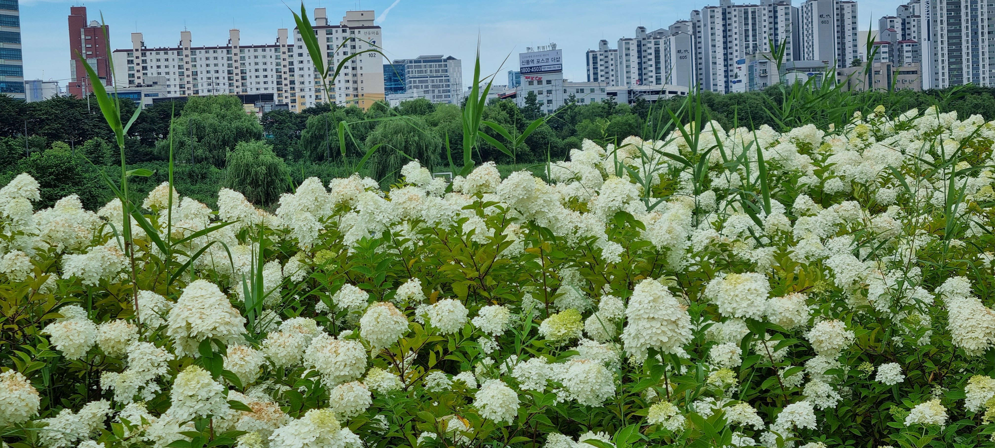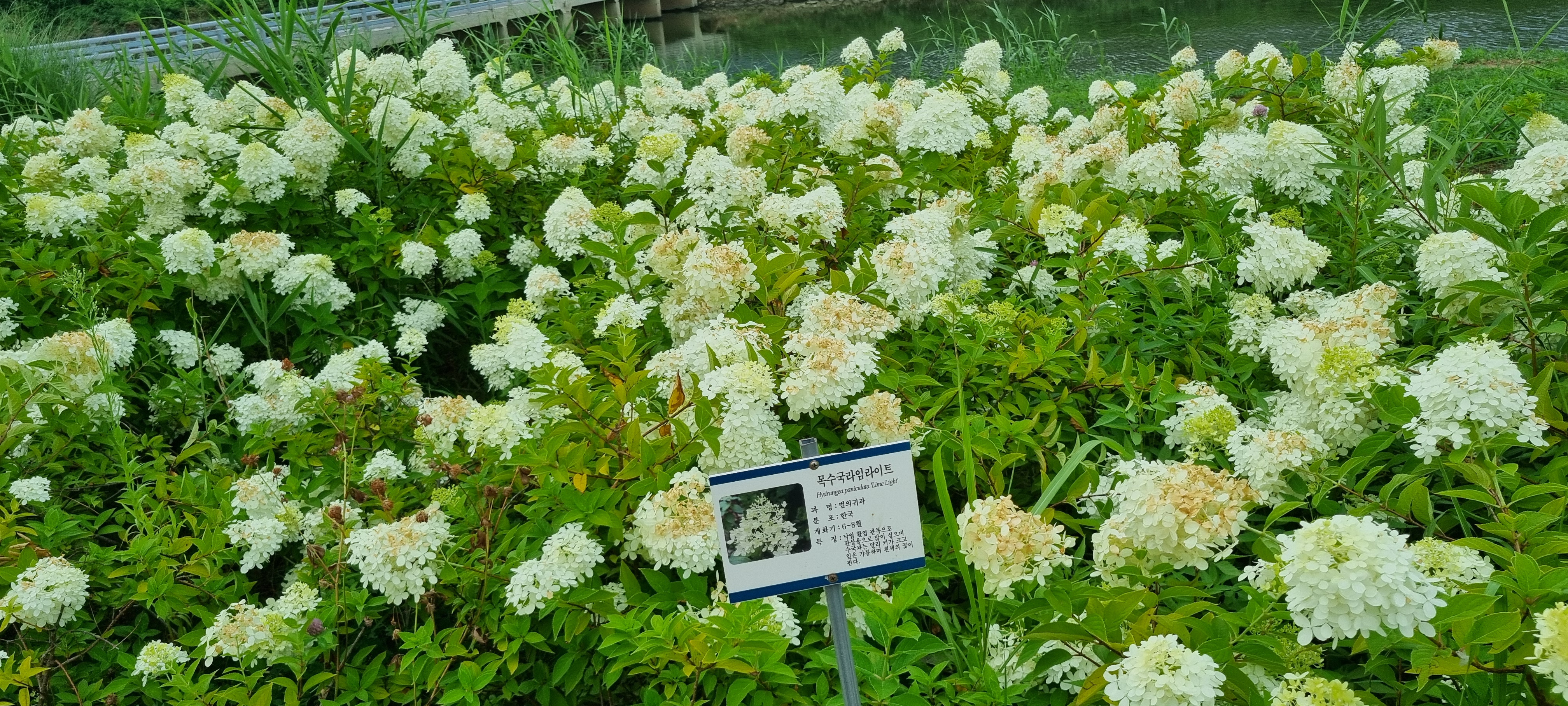 7월 어느 날 다시 오니 그동안 목수국이 피었다 색이 변하고 있다.