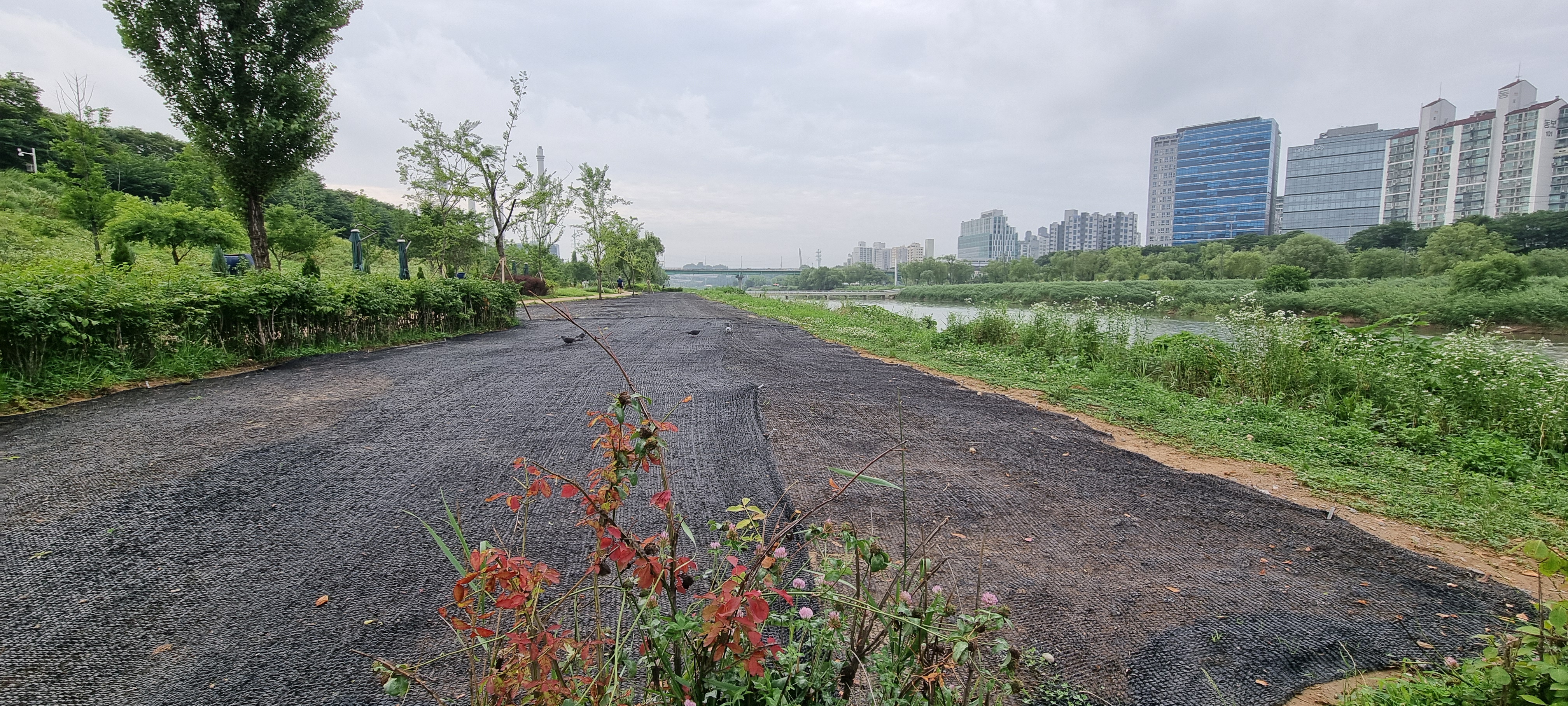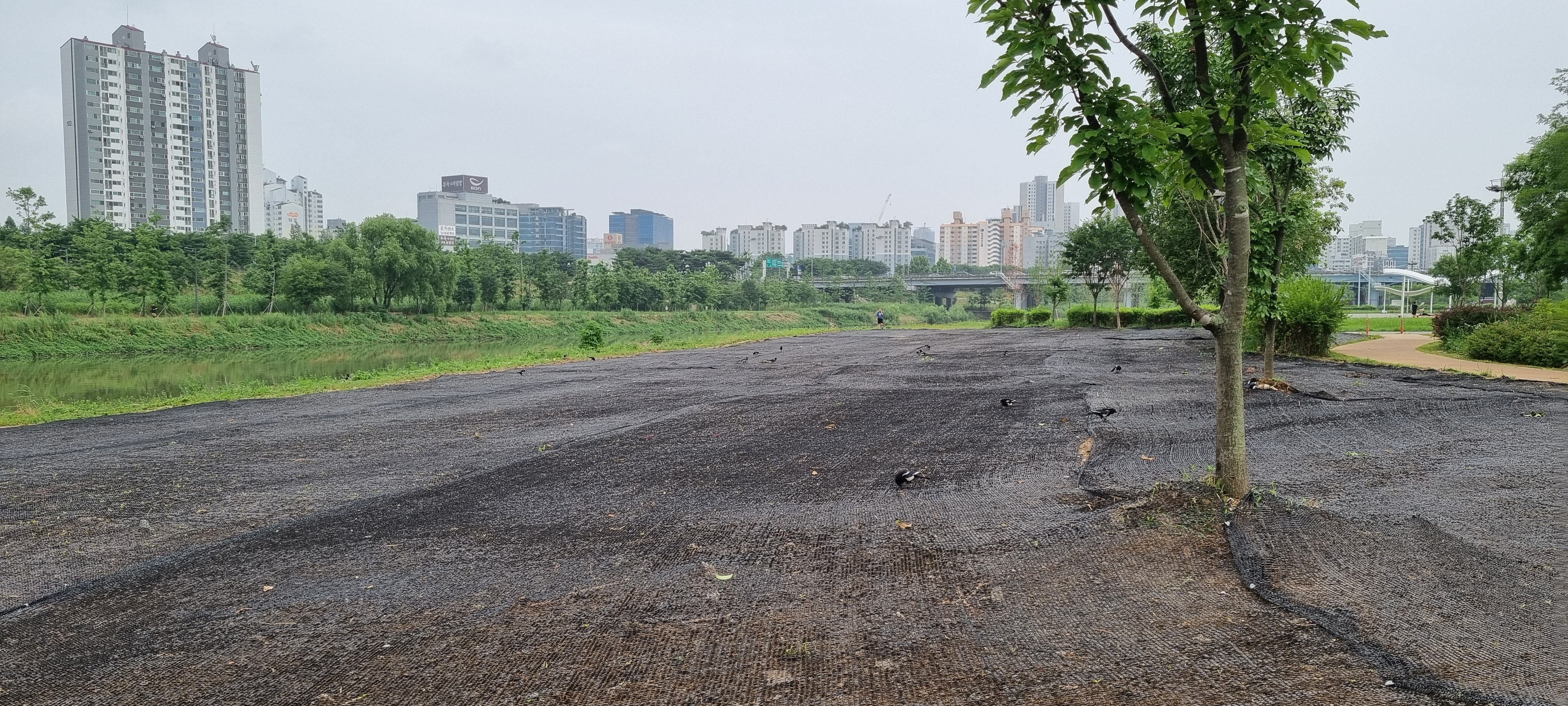 개천 옆으로 길게 부직포로 덮어 두었다.