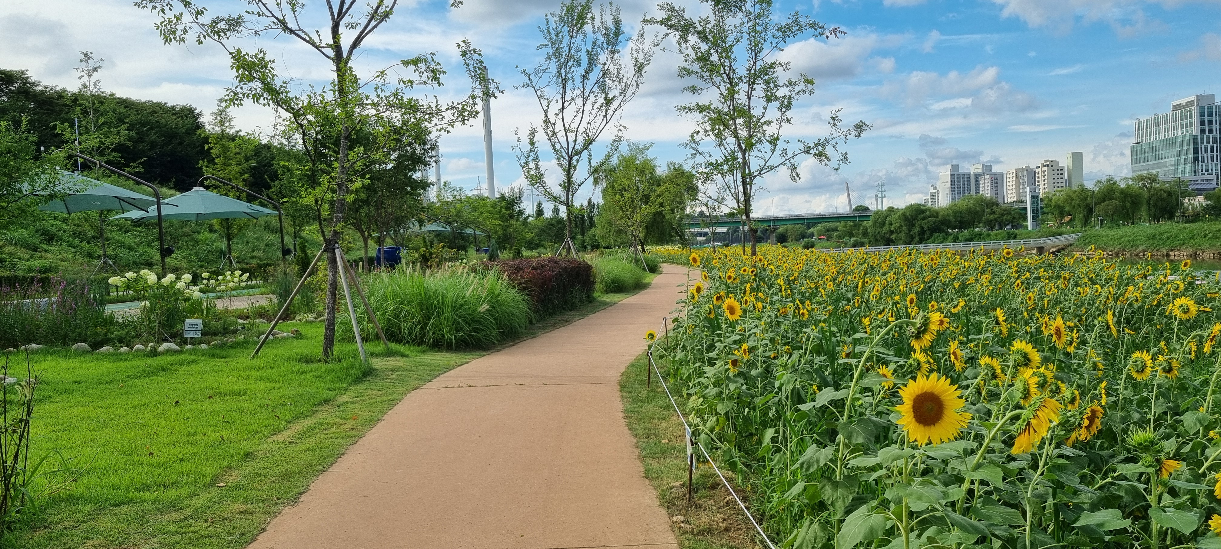 내가 서 있는 둑방길, 황토 흙길, 자전거 전용 도로, 그 옆에 인도, 그리고 해바라기 옆 길.