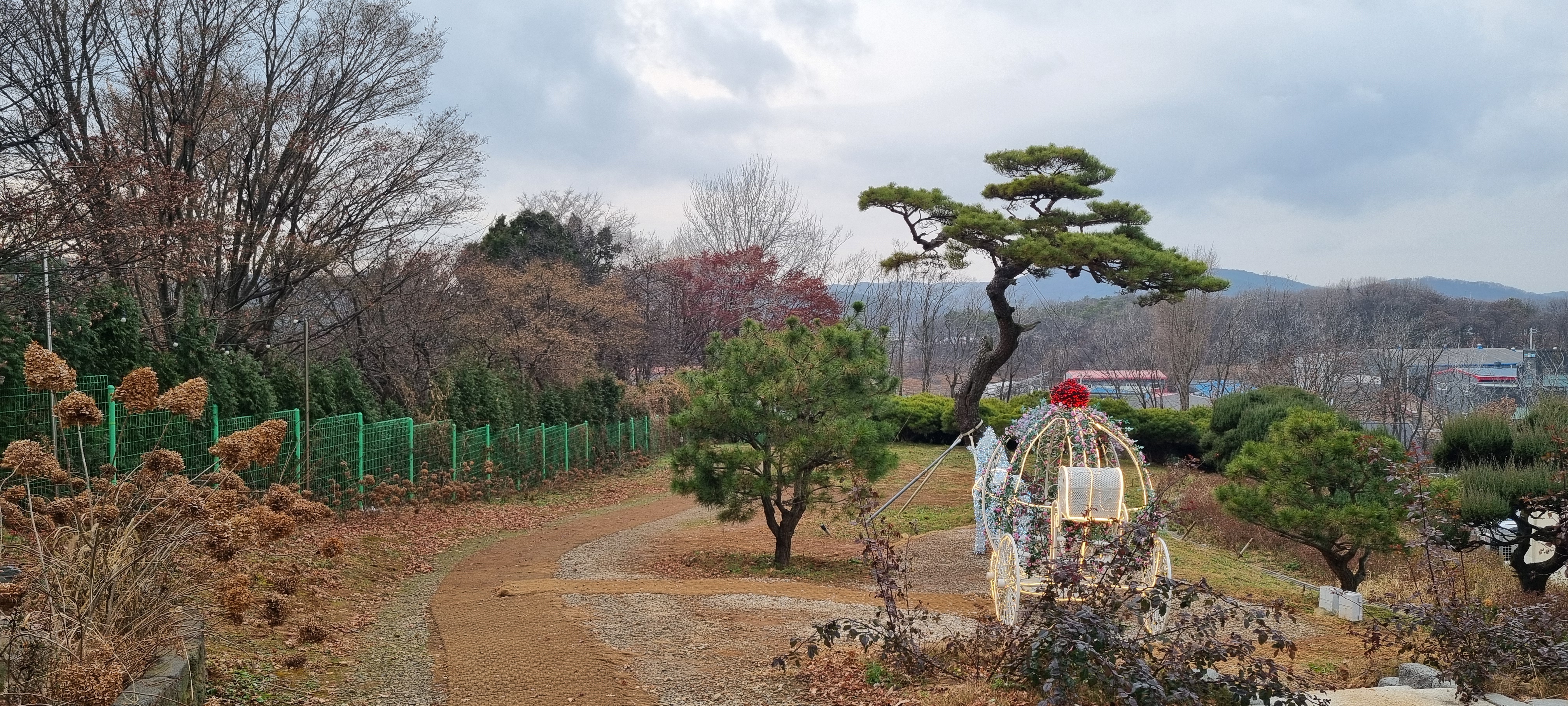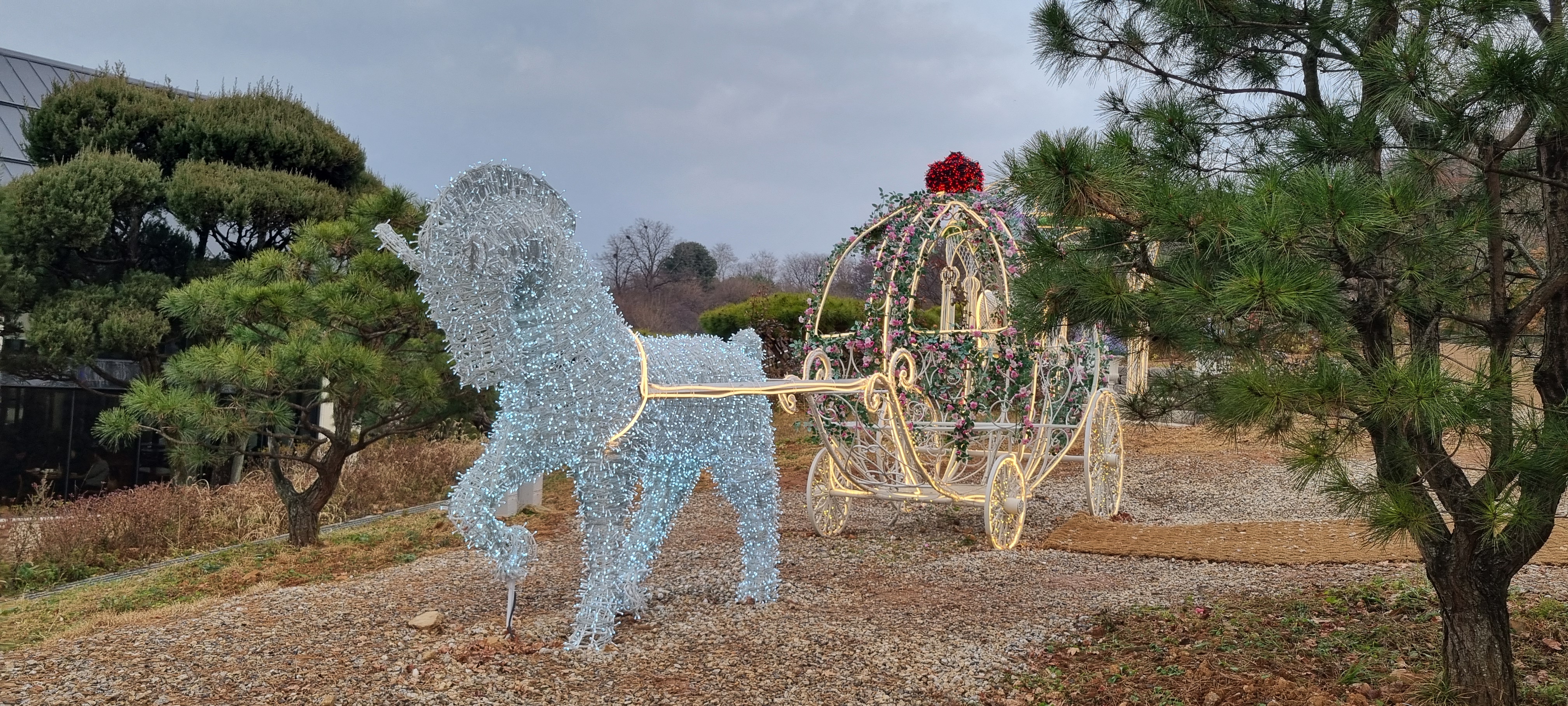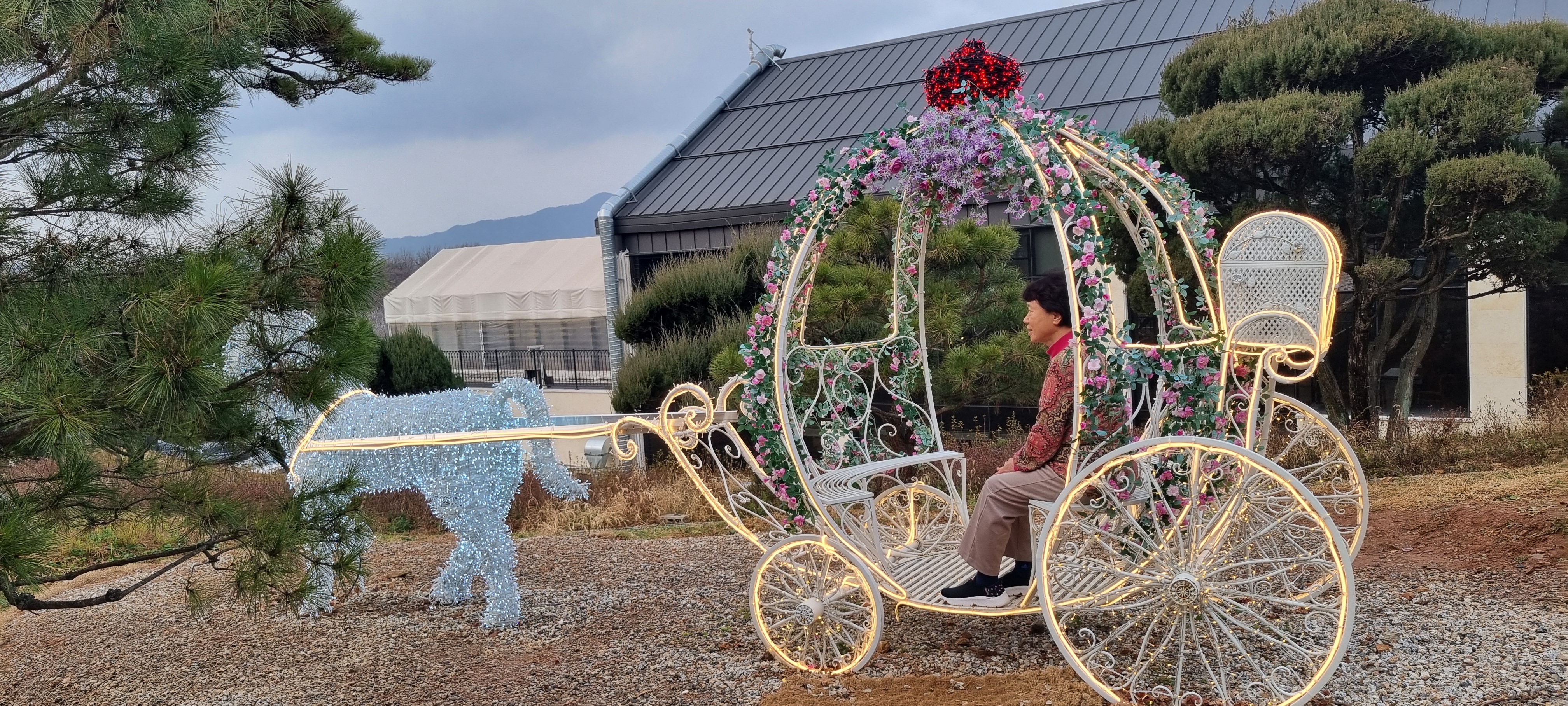 작은 마차 위에 조화지만 예쁜 꽃들로 장식해 두었지만
