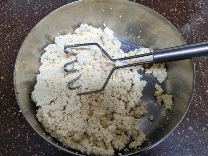 감자 으깨는 기구로 두부를 곱게 으깬다.