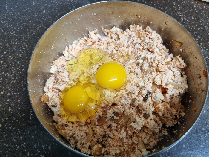 두부와 김치를 고루 섞다 계란 두 개를 깨어 넣고 다시 섞었다.
