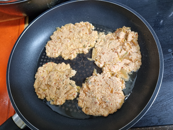 팬에 기름을 두르고 반죽을 숟가락으로 떠서 올렸다.