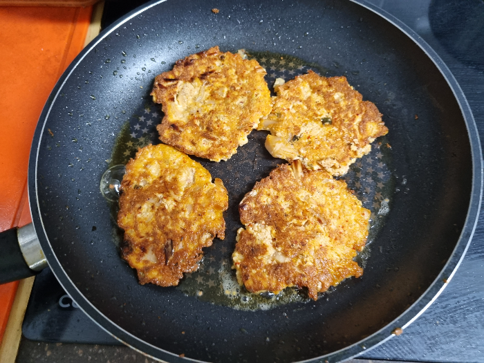 다행히 전분 가루가 들어가니 뒤집어도 안 으스러진다.