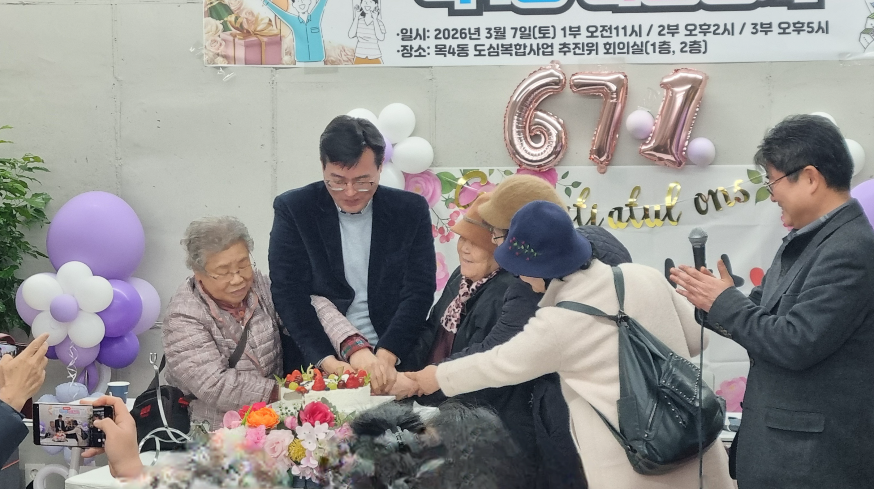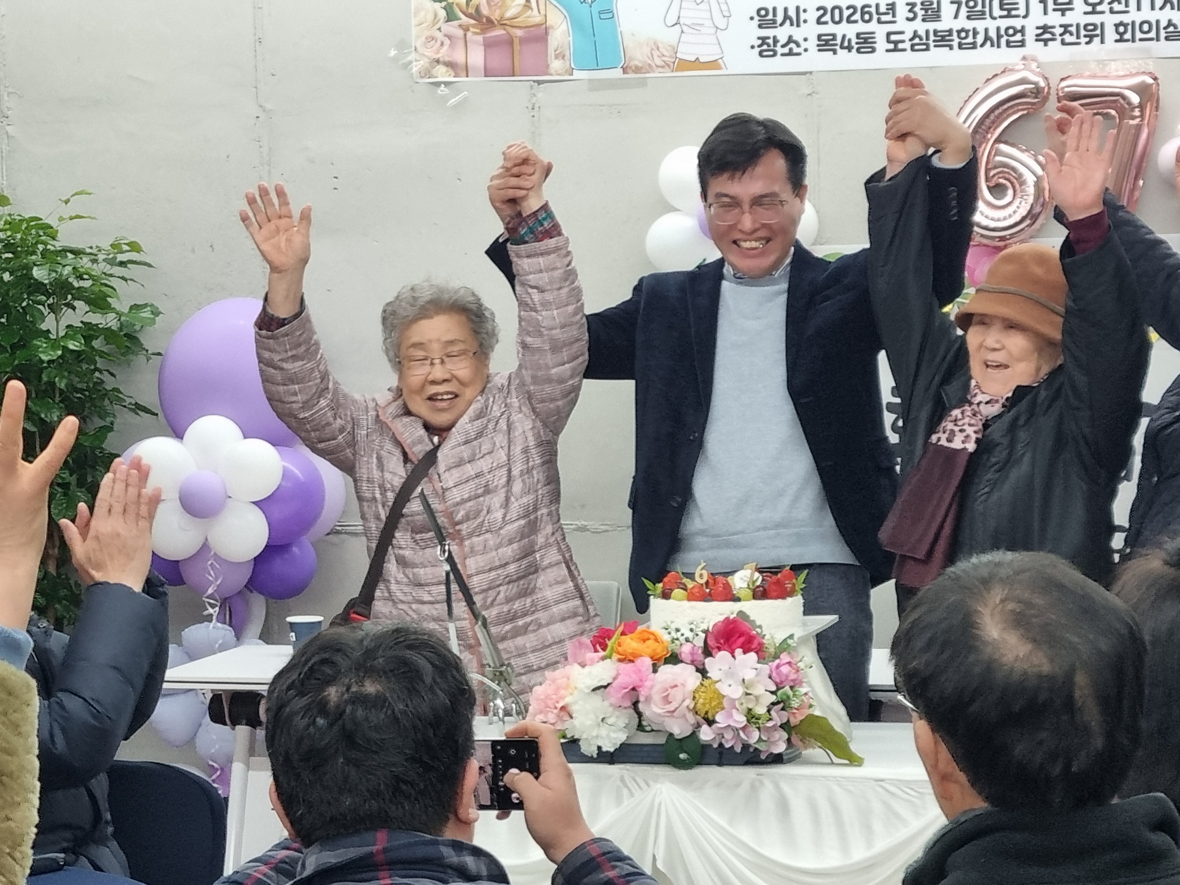 케이크 커팅하기 전 목4동 만세와 파이팅을 외치고