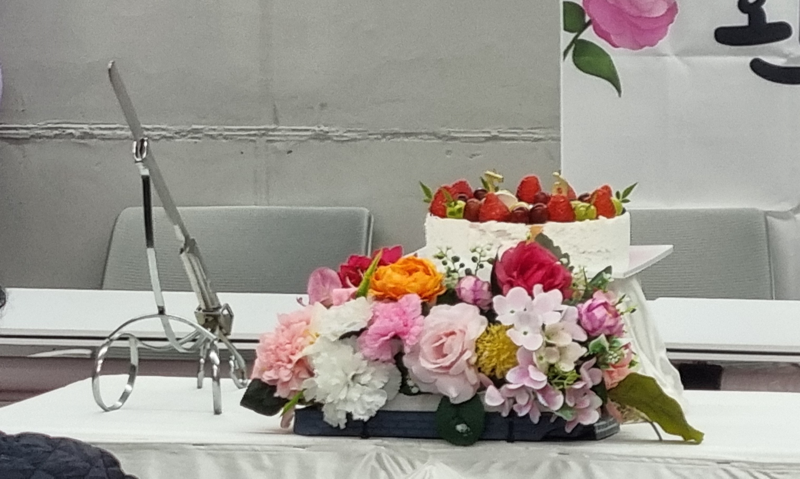 제일 먼 곳에서 오신 분과 케이크 컷팅을 하고 있다.