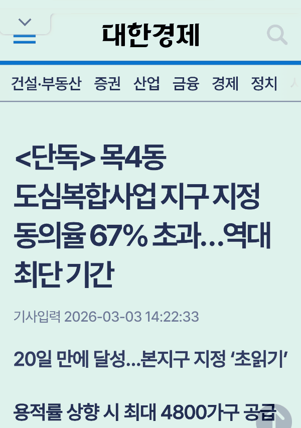 지난 3월 3일 대한 경제 신문에 우리 동네 도심 복합 사업지구 지정 동의률이